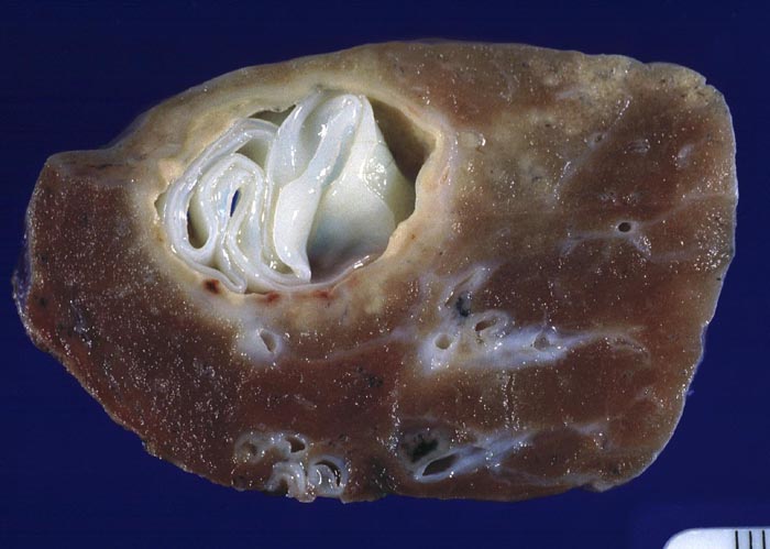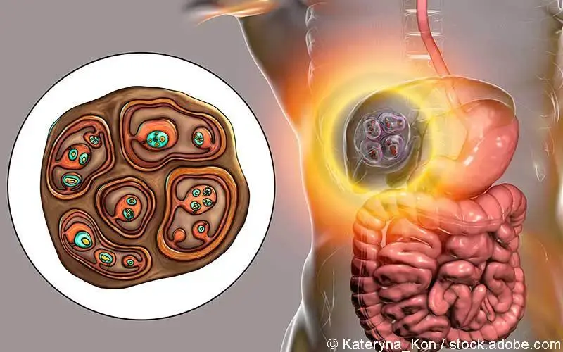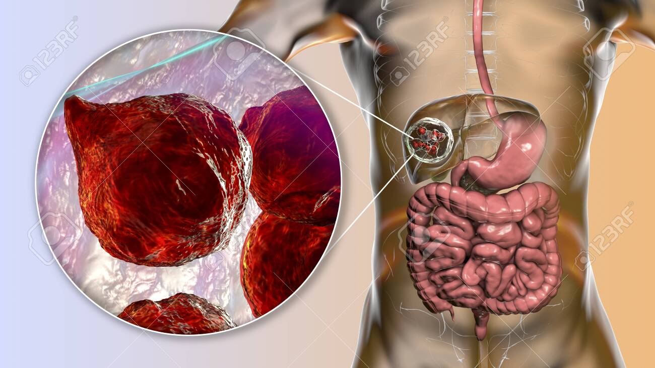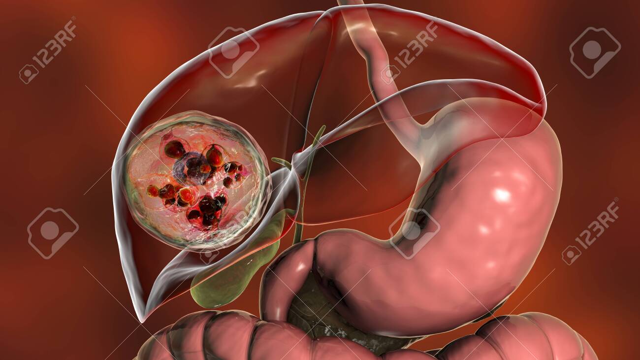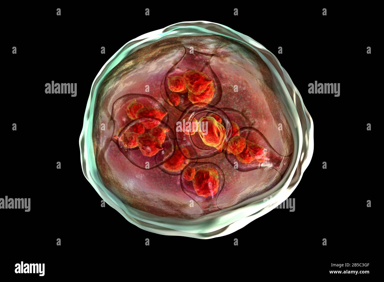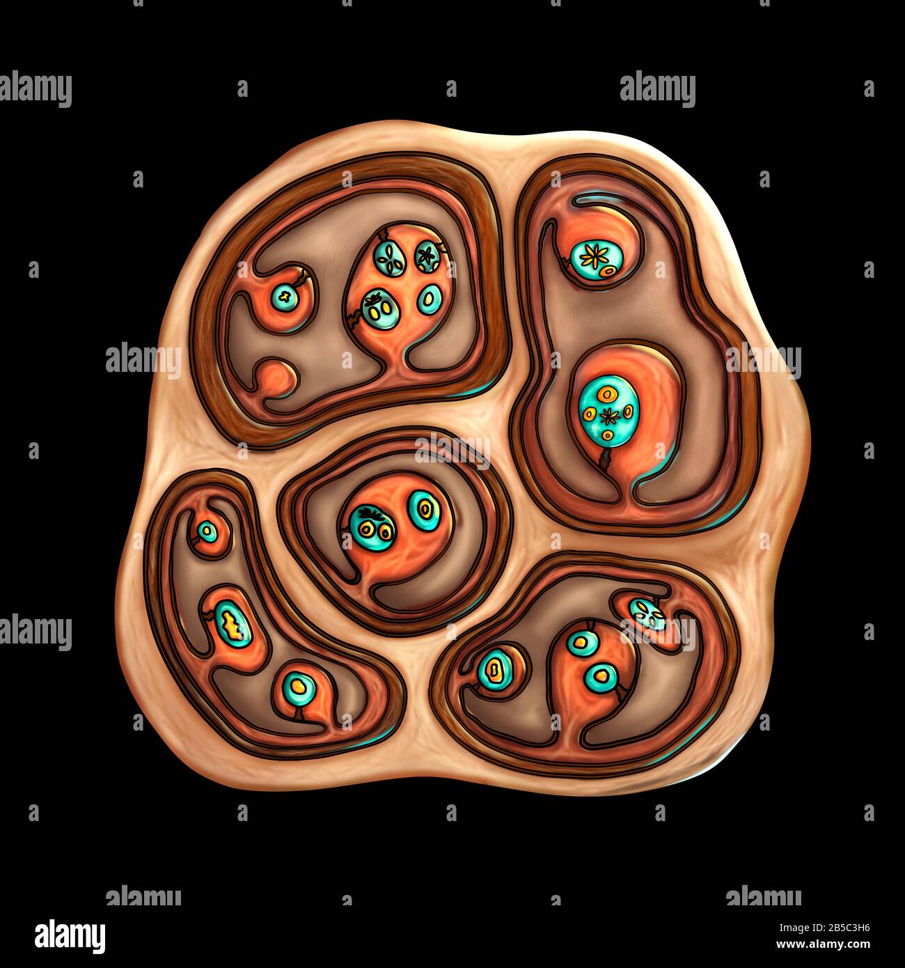 Hydatidenzyste Von Echinococcus Multilocularis In Der Leber, 3D-Darstellung. E. Multilocularis Ist Ein Parasitärer Wurm, Der Eine Alveoläre Echinokokkose Mit Zystenbildung In Der Leber Verursacht Lizenzfreie Fotos, Bilder und Stock Fotografie. Image ...