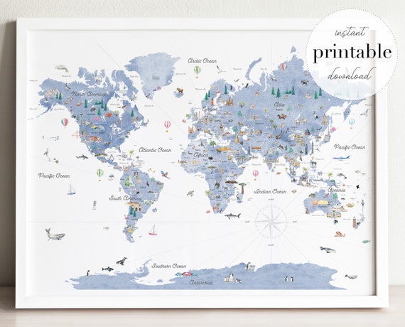 Blaue Weltkarte zum Ausdrucken Kinder Weltkarte Kinderzimmer ...