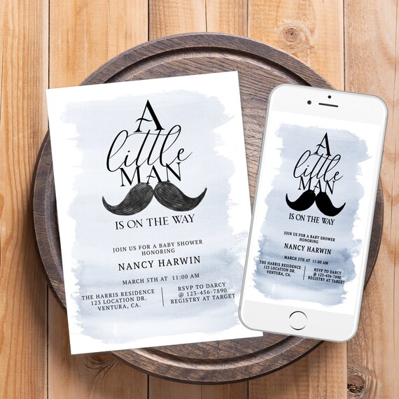 Little Man Baby Shower Einladungsvorlage druckbare blaue und graue Schnurrbart 15x7 und 10x15 LM001 - Etsy.de