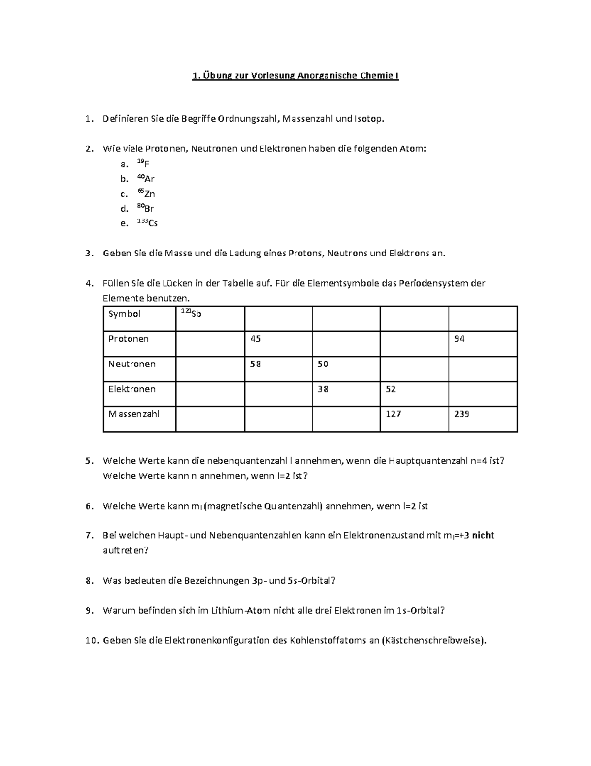 Übung 1 - 1. Übung zur Vorlesung Anorganische Chemie I Definieren Sie die Begriffe Ordnungszahl, - Studocu