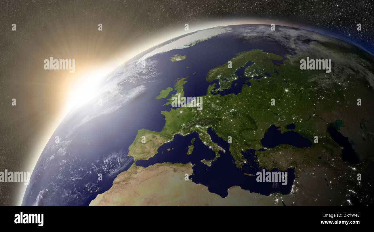 Sonnenuntergang über Europa Region auf Planeten, die Erde aus dem Weltraum mit Sonne angesehen und Sterne im Hintergrund. Elemente des Bildes von der NASA eingerichtet Stockfotografie - Alamy