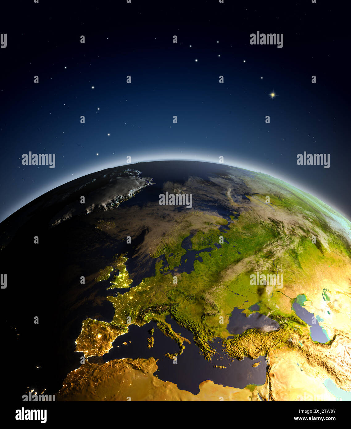 Sehr Detailliert. 3d Übertragen Mit Hilfe Von Satellitenbildern (NASA). Planet Erde Europa-Zone Mit Der Nacht Und Sonnenaufgang Lizenzfreie Fotos, Bilder und Stock Fotografie. Image 41795639.
