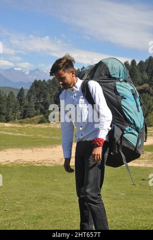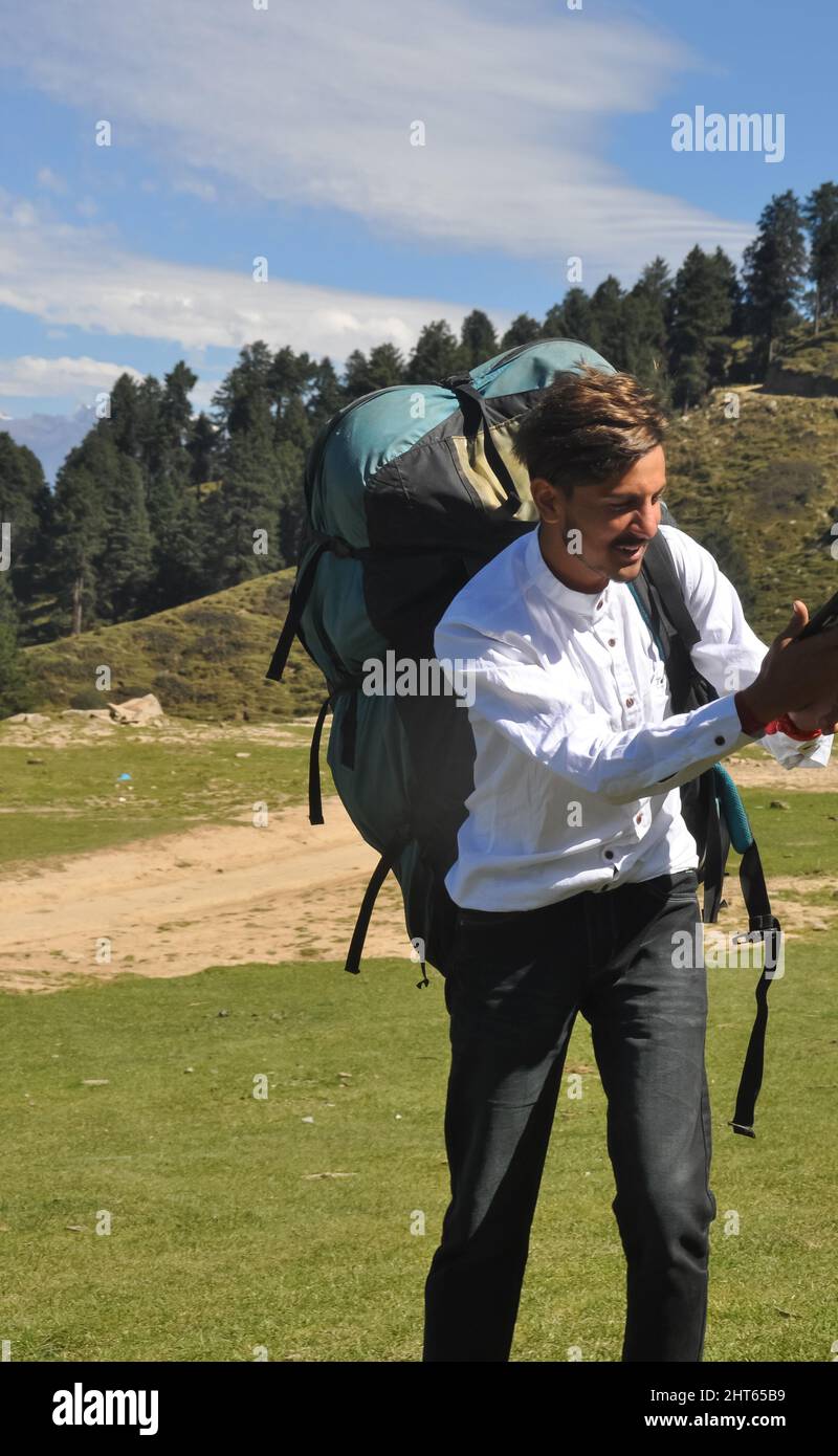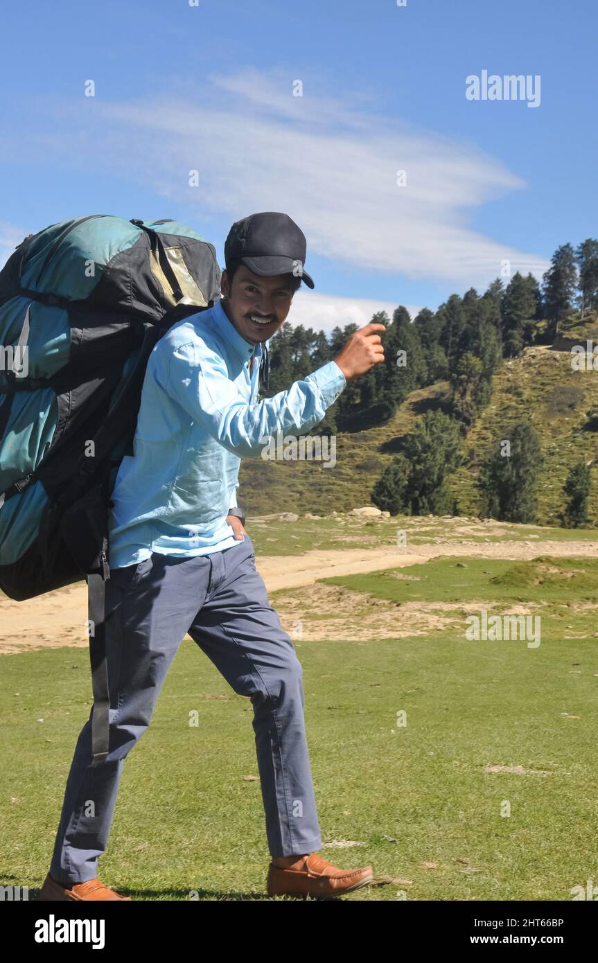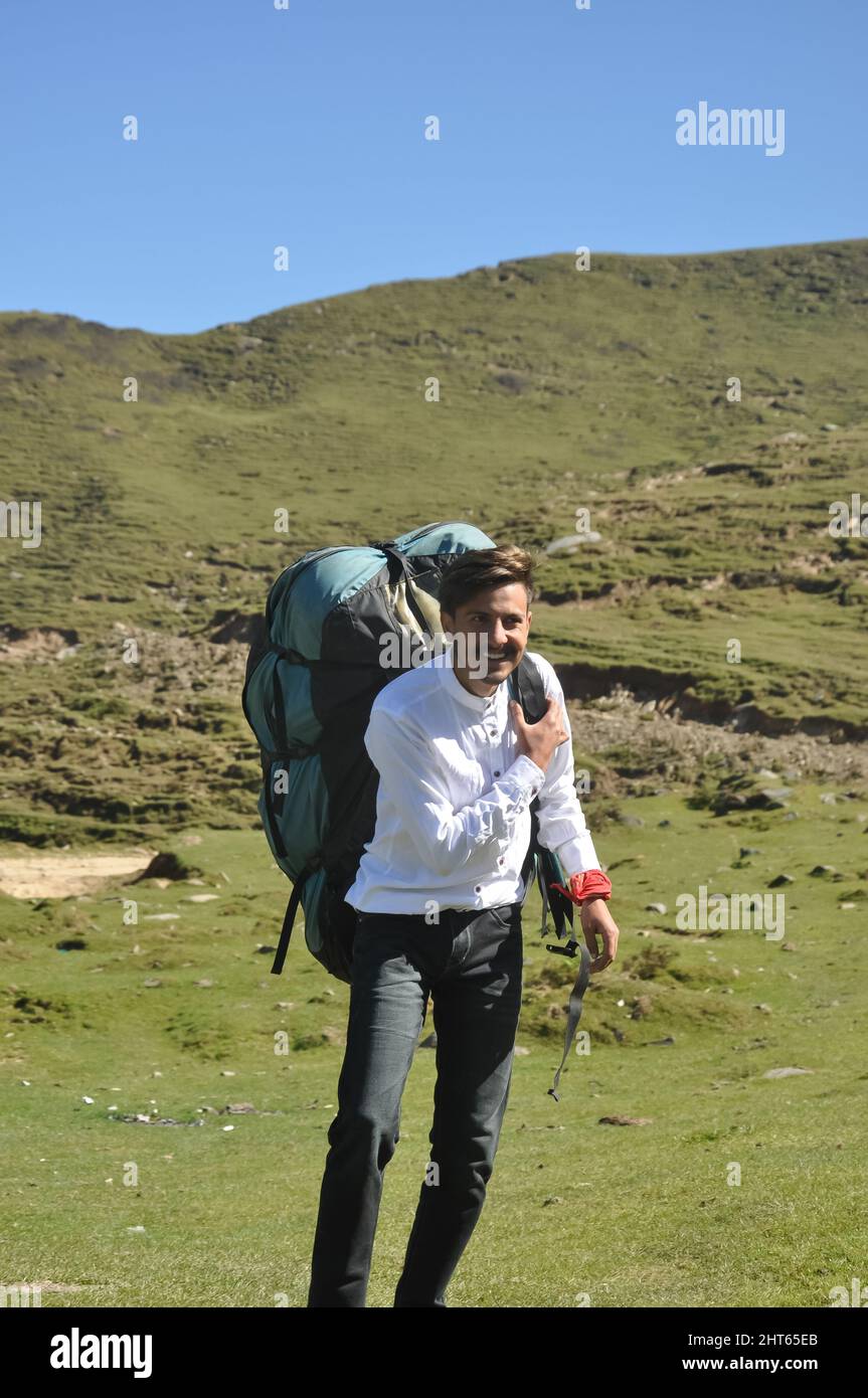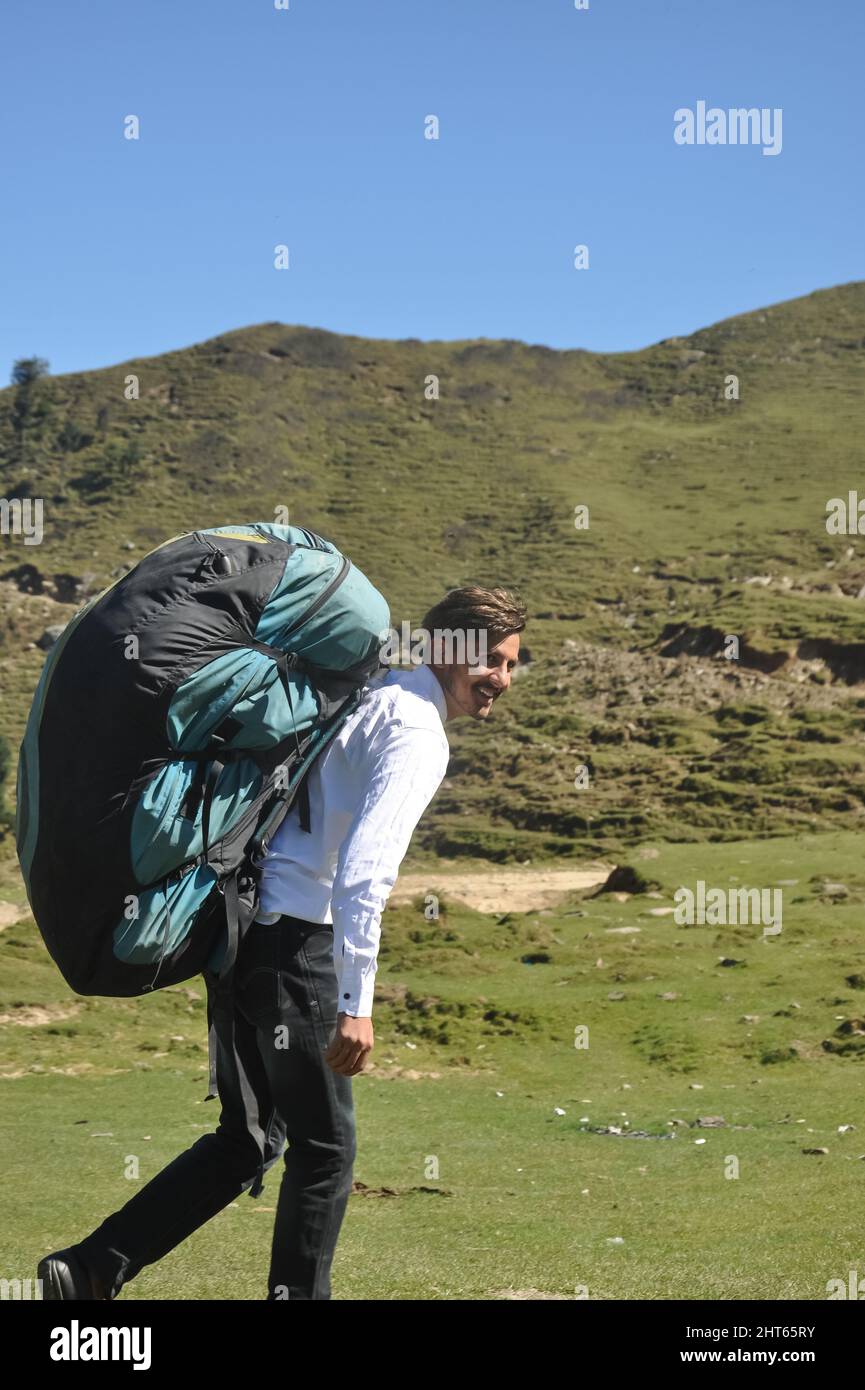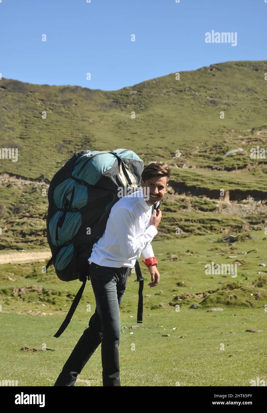 Die ganze Länge eines jungen Mannes lächelnd, Blick auf die Kamera, während Sie mit Fallschirmrucksack in den Berg zu Fuß Stockfotografie - Alamy