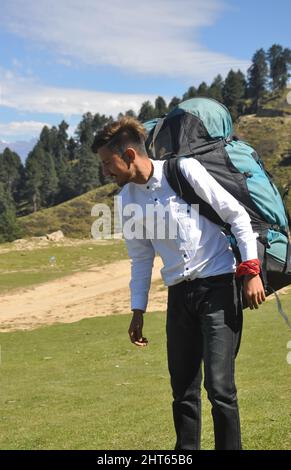 Die ganze Länge eines jungen männlichen Reisenden, der auf dem Berg mit dem Fallschirmrucksack unterwegs ist Stockfotografie - Alamy