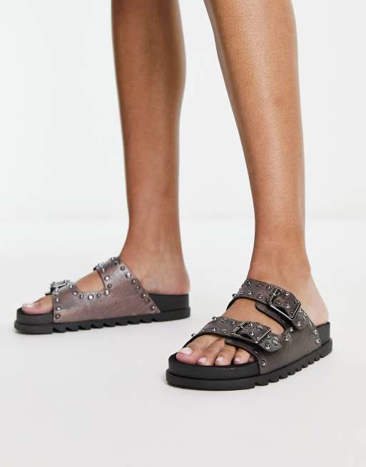 ASOS DESIGN – Fantasy – Flache Sandalen in Metallic-Zinngrau mit Nietenverzierung | ASOS