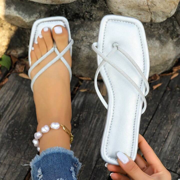 Flache Sandalen mit Perlen und quadratischem Dekor für Damen, modische Zehenstegsandalen für Outdoor | aktuelle Trends, günstig kaufen | SHEIN Deutschland
