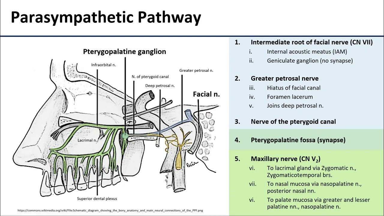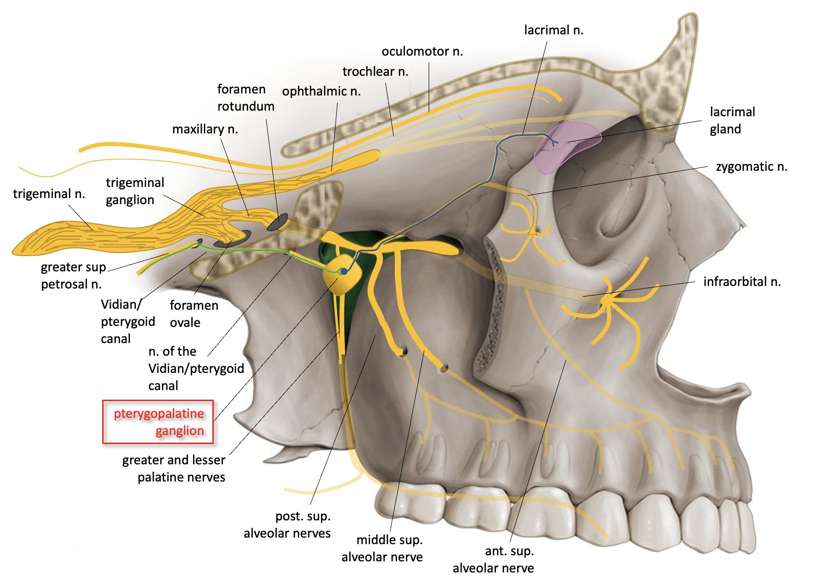 Aaron Rutman, MD on X: "Within the PPF lives the PTERYGOPALATINE GANGLION (PPG) which contains post-synaptic parasympathetic cell bodies-->lacrimal gland and sinus/nasal/oral mucosa. Many other sympathetic and somatic nerves travel through the