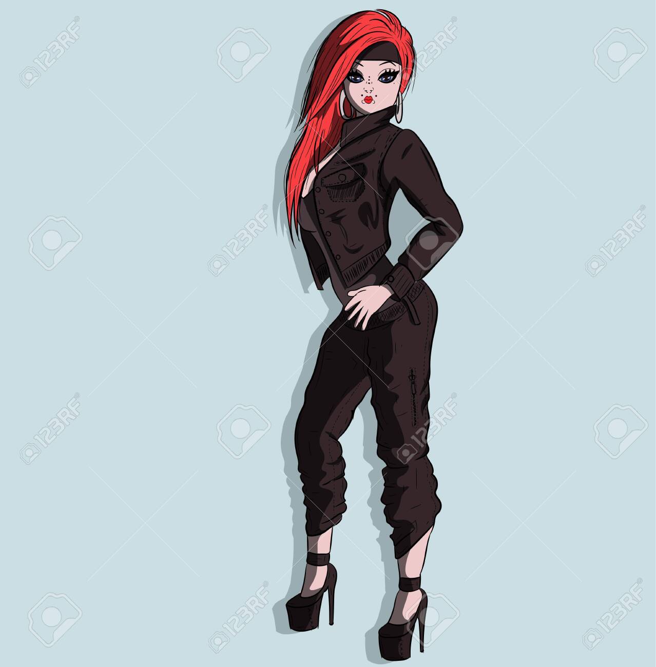 Gangsta-Metalhead-Mädchen Mit Einem Bandana Und Einer Lederjacke, Die Für Die Kamera Posiert. Rocker Mit Roten Haaren In High Heels. Lizenzfrei nutzbare SVG, Vektorgrafiken, Clip Arts, Illustrationen. Image 147116498.