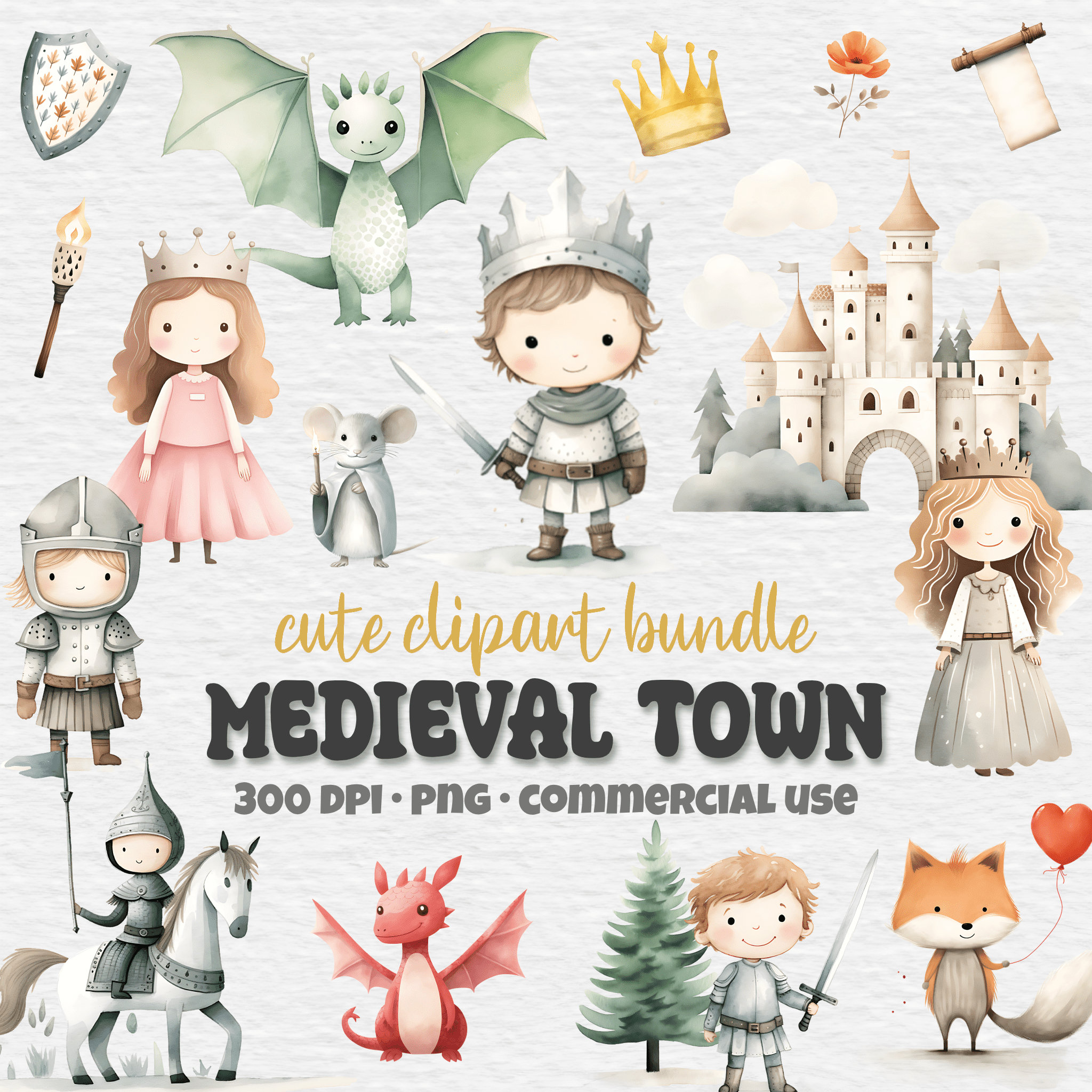 Cute Medieval Town Clipart Bundle, Watercolor Middle Ages, Knight ...