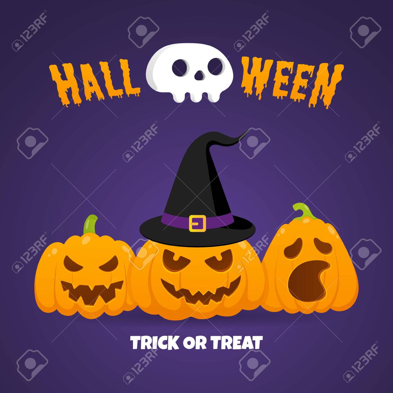Fröhliche Halloween-Kürbisse Mit Gruseligen Gesichtern Ausdrucken Grimasse, Mit Hexenhut Und Flacher Designvektorillustration Des Menschlichen Schädels Einzeln Auf Dunklem Hintergrund Und Text. Lizenzfrei nutzbare SVG, Vektorgrafiken, Clip Arts ...