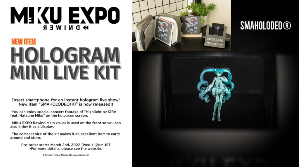 MIKU EXPO on X: "[New limited product] #MIKUEXPORewind/Mini Hologram Kit – “SMAHOLODEO🄬” The concert footage of “Highlight by KIRA feat. Hatsune Miku” comes back to life as a hologram! #SMAHOLODEO will be