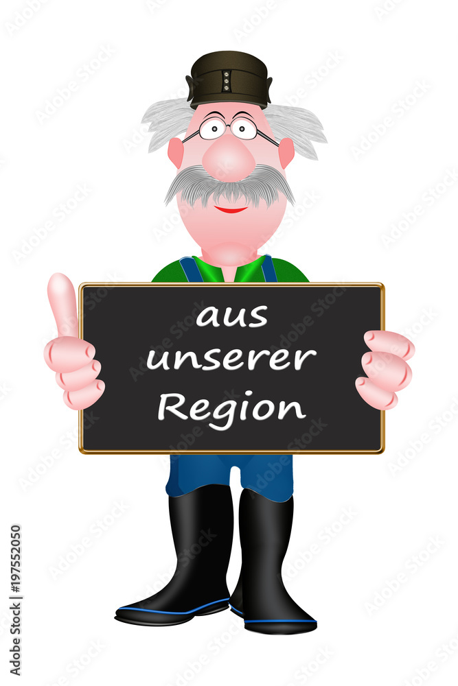 Aus unserer Region, freundlicher Bauer mit Schild, weißer Hintergrund Stock Illustration | Adobe Stock