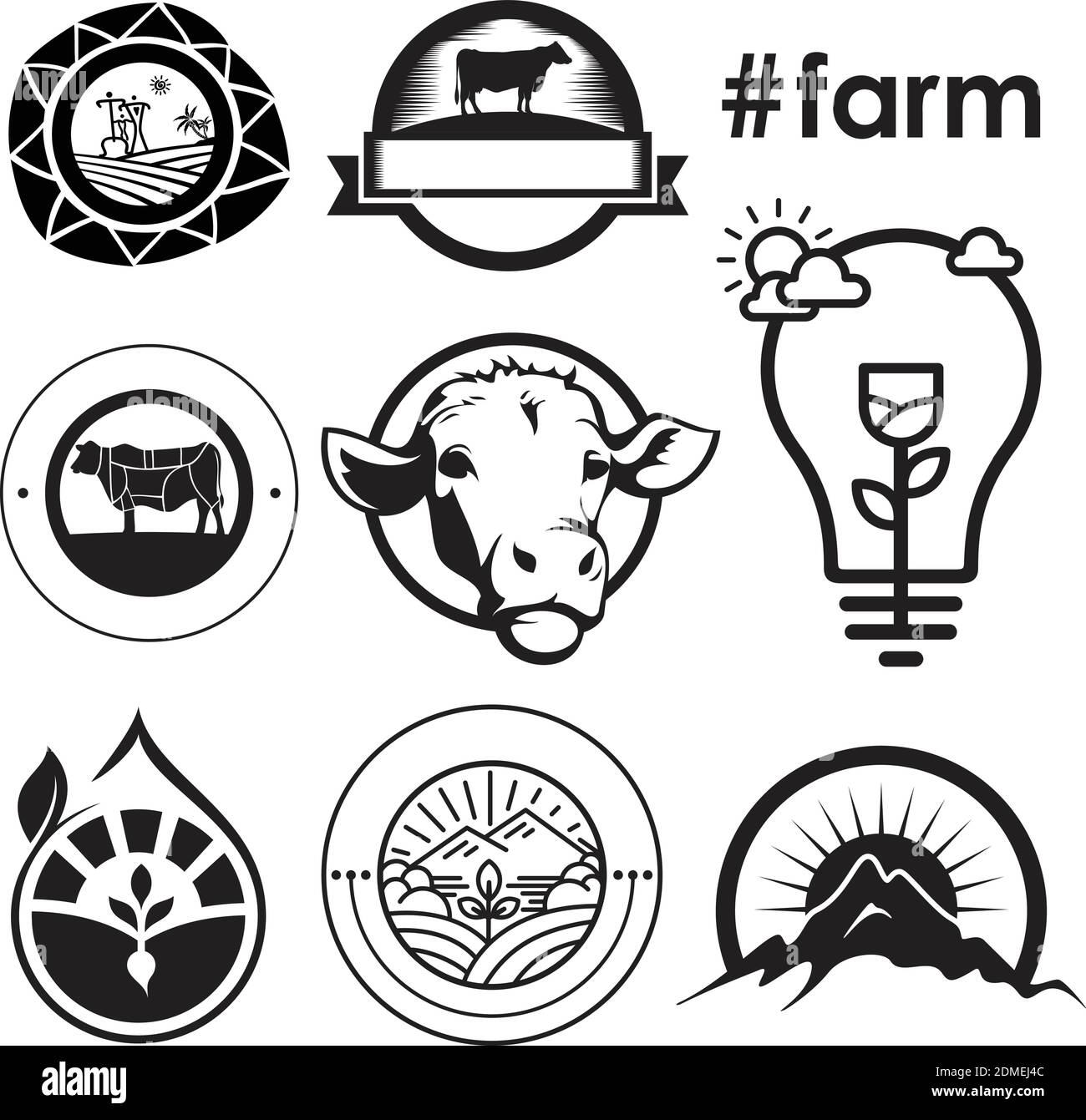 Bauernhof Konzept Logo Emblem. Vorlage mit Farmlandschaft. Label für natürliche landwirtschaftliche Produkte. Schwarzes Logo isoliert auf weißem Hintergrund. Vektor-Abb Stock-Vektorgrafik - Alamy