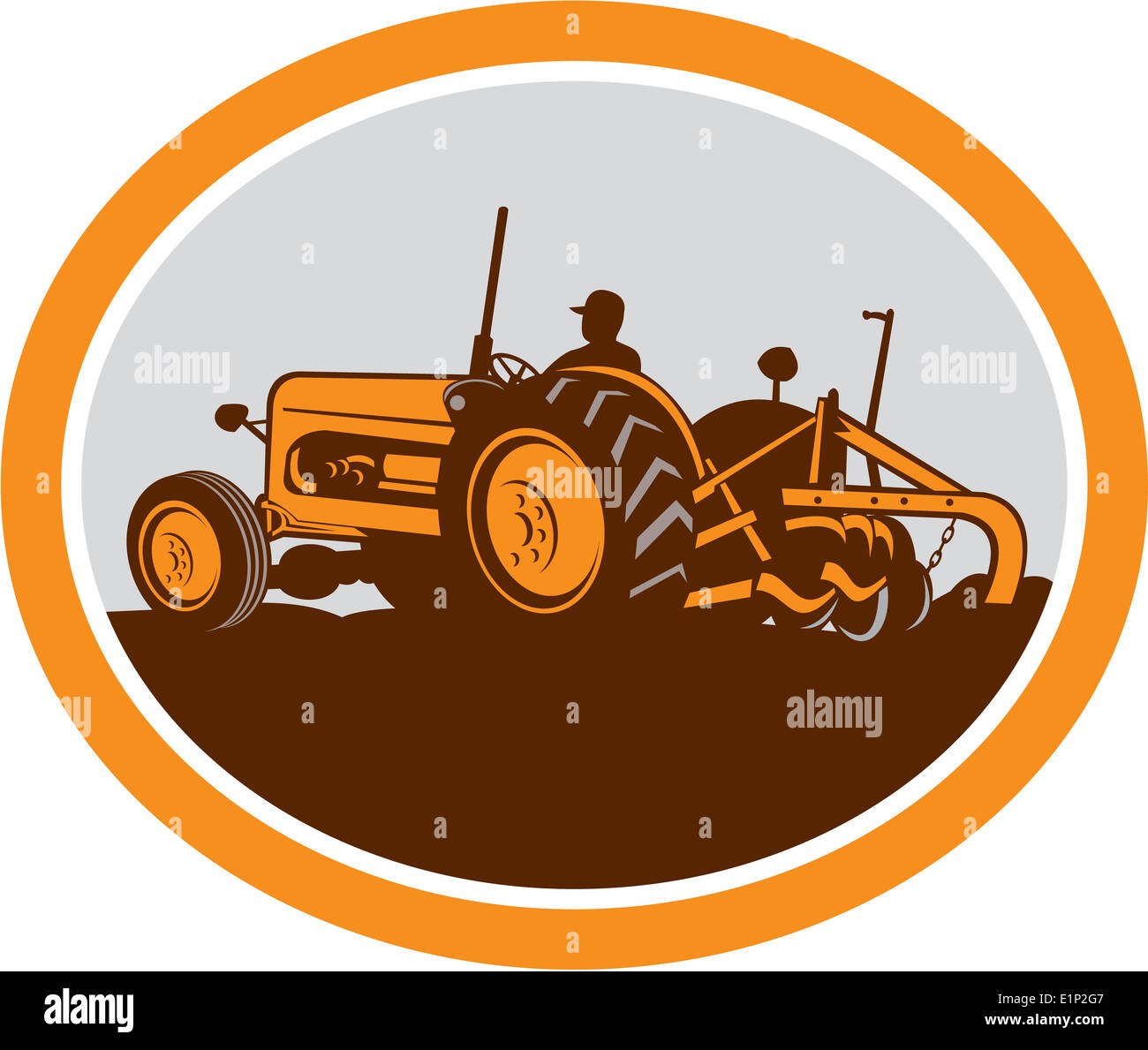 Abbildung von einem Oldtimer-Traktor mit Bauer Fahrer Pflügen Feld Sideview im Inneren ein Oval im retro-Stil auf isolierte Hintergrund getan Stockfotografie - Alamy