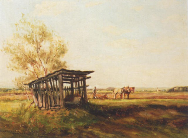 Pflügender Bauer mit Dorf im Hintergrund by Ernst Haymann on artnet