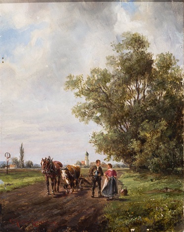Pflügender Bauer im Gespräch mit einer Magd, im Hintergrund Kirchdorf by Ludwig Müller-Cornelius on artnet