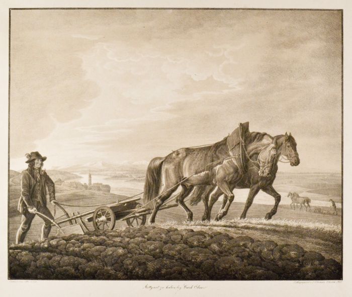 PFERDE. - Pflügender Bauer. Der Bauer mit Hut und Pfeife, führt den Pflug den zwei Pferde den Hügel hinaufziehen, rechts hinten ein weiteres Gespann beim Pflügen. Im Hintergrund eine breite Flußlandschaft mit