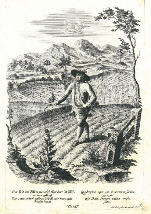 LANDWIRT. - "Hier sind der Felder viererley" usw. Blick in eine Flußlandschaft mit Bauer in Tracht bei der Aussaat von Hand, begleitet von vielen Vögeln, im Hintergrund Berge, unten Verse.