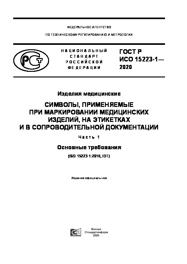 ГОСТ Р ИСО 15223-1-2020 Изделия медицинские. Символы, применяемые при маркировании медицинских изделий, на этикетках и в сопроводительной документации. Часть 1. Основные требования