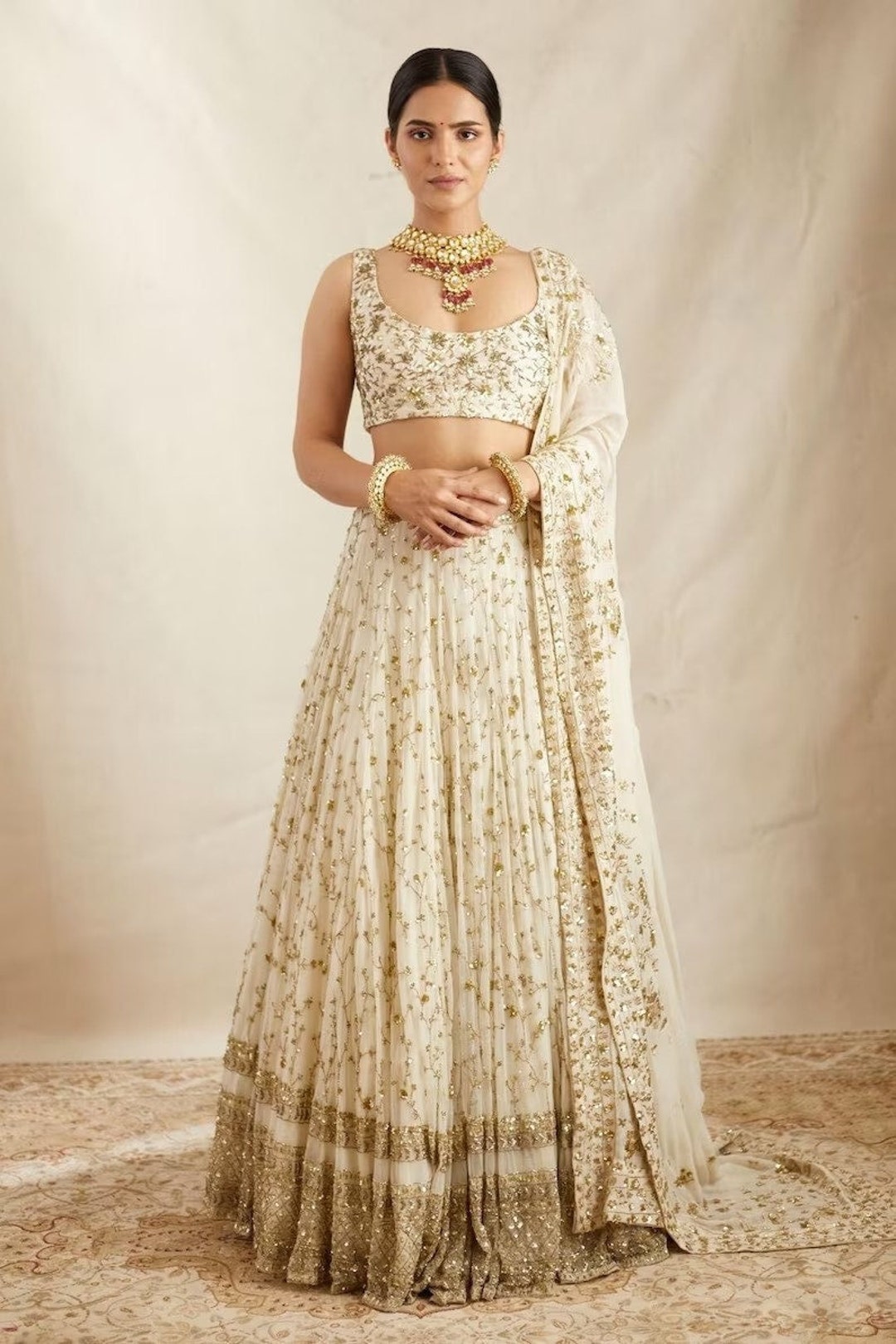 Featuring an off-white raw silk bridal lehenga set paired with two butterfly net dupattas with gold zardozi & aari embroidery. Jewellery:… | Instagram
