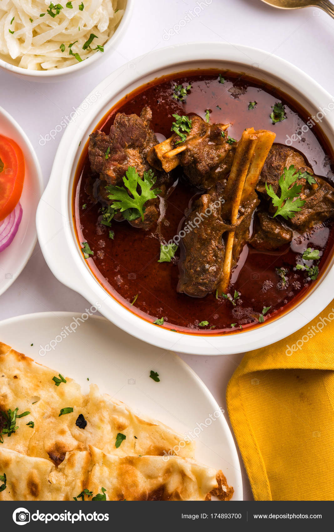 Indisches Hammelfleisch mit gebratener puri-Tomate, Zwiebelsalat ...