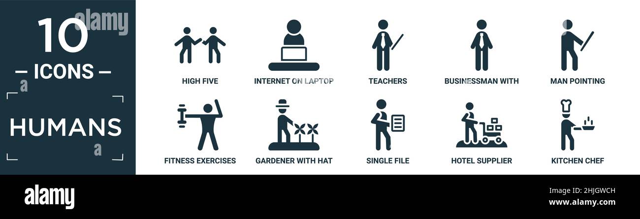 Filled humans icon set. contain flat high five, internet on laptop ...
