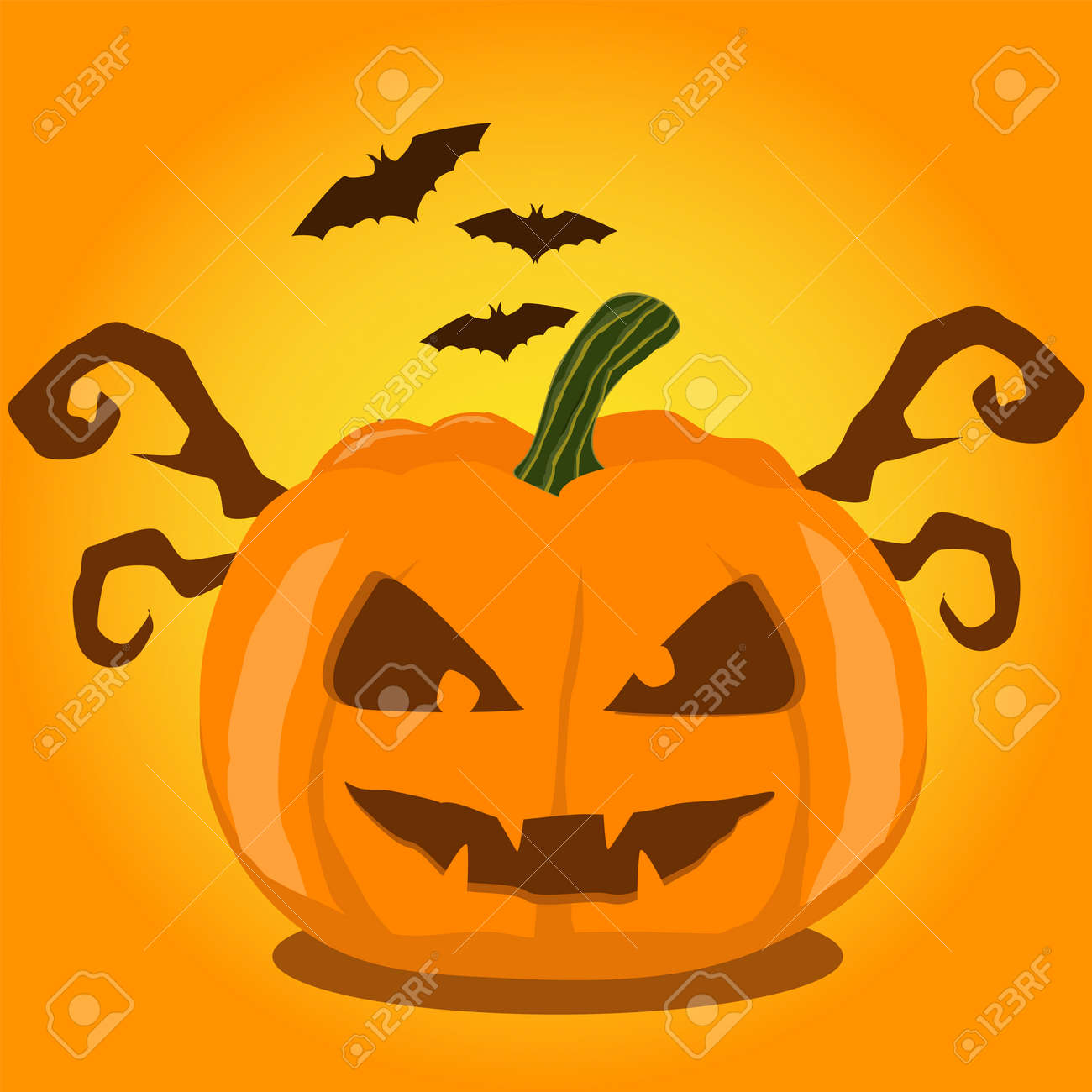 Halloween-Kürbis Mit Jack O Lantern-Gesicht Und Fledermäusen Auf Orangefarbenem Hintergrund. Vektor-Illustration Lizenzfrei nutzbare SVG, Vektorgrafiken, Clip Arts, Illustrationen. Image 170666543.