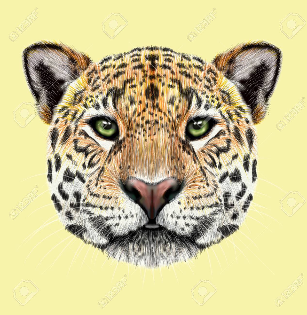 Illustrated Portrait Of Jaguar. Cute Fluffy Face Of Big Cat With Green Eyes On Tan Background. Stock Photo, Picture and Royalty Free Image. Image 75937075.