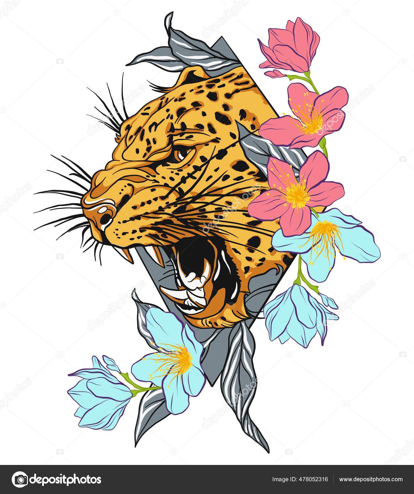 Leopard Jaguar Tätowierung Mit Blumen Jaguar Gesicht Mit Blumen Farb Stock-Vektorgrafik von ©Miklovash 478052316