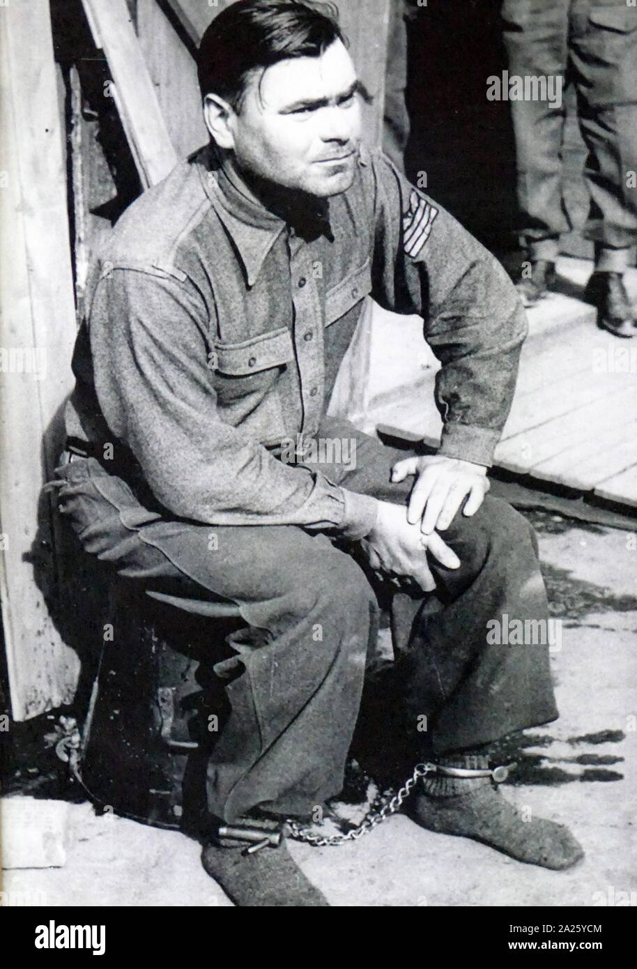 A photograph of a shackled Josef Kramer. Josef Kramer (1906-1945) the Commandant of Auschwitz-Birkenau and of the Bergen-Belsen concentration camp. Dubbed The Beast of Belsen, he was a notorious German Nazi war