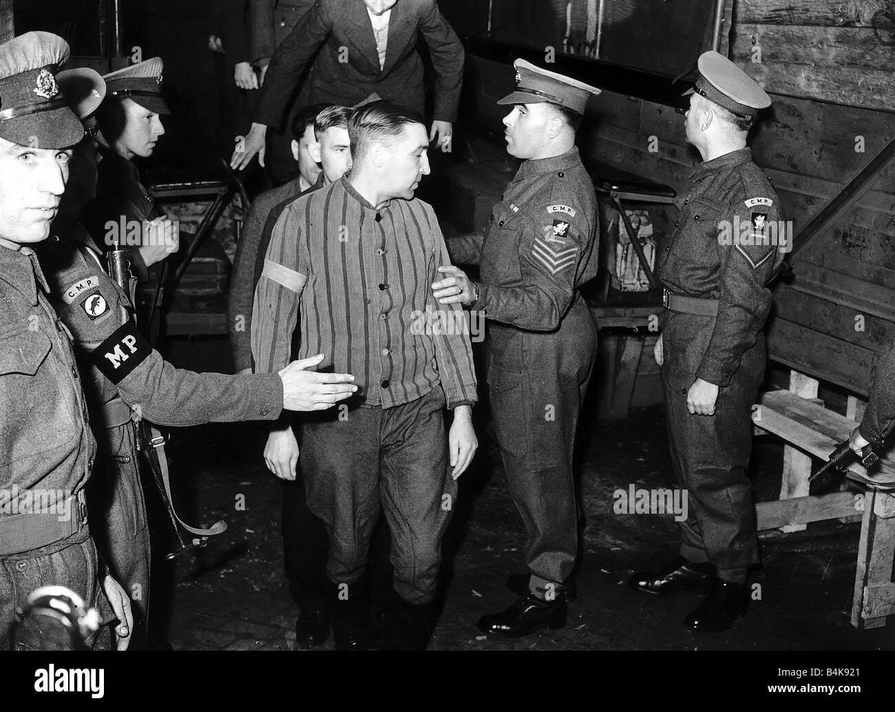 Josef Kramer BESTIA DI BELSEN in corone ferri, con una guardia militare britannica, era Hauptsturmführer e il comandante di Auschwitz-Birkenau e dei campi di concentramento Bergen-Belsen. Soprannominato la Bestia di Belsen dai