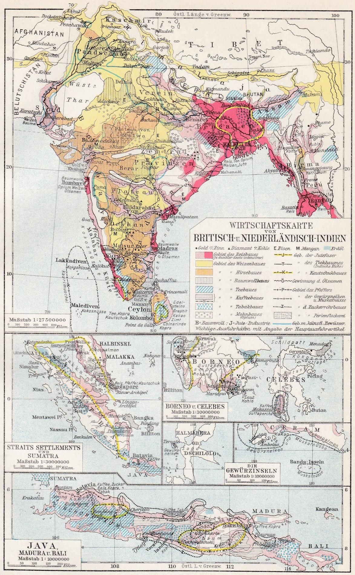 Original-historische Landkarte. 1. Wirtschaftskarte Von Britisch- u. Niederländisch-Indien, Maßstab 1 : 27 500 000; Nebenkarten: Straits Settlements und Sumatra, Maßstab 1 : 30 000 000; Borneo u. Celebes, Maßstab 1 : 30