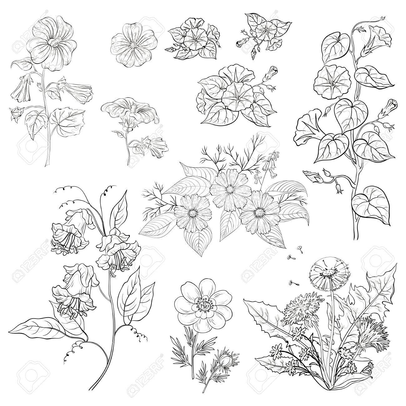 Set Mit Blumen Auf Weißem Hintergrund Kosmos, Malve, Ipomoea ...