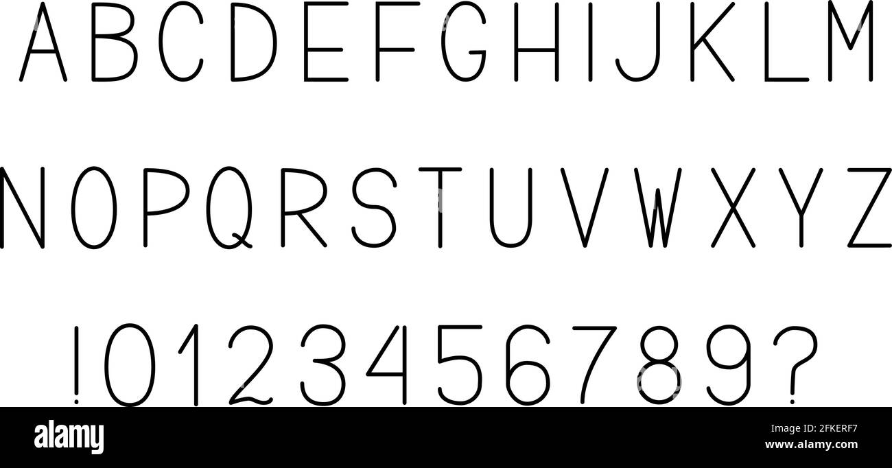 Minimalistisches Vektoralphabet. Buchstaben A-Z, Zahlen 0-9 und auf Weiß isolierte Satzzeichen. Sans serif-Schriftart. Lateinische Großbuchstaben. Schlankes, enges Kapital Stock-Vektorgrafik - Alamy