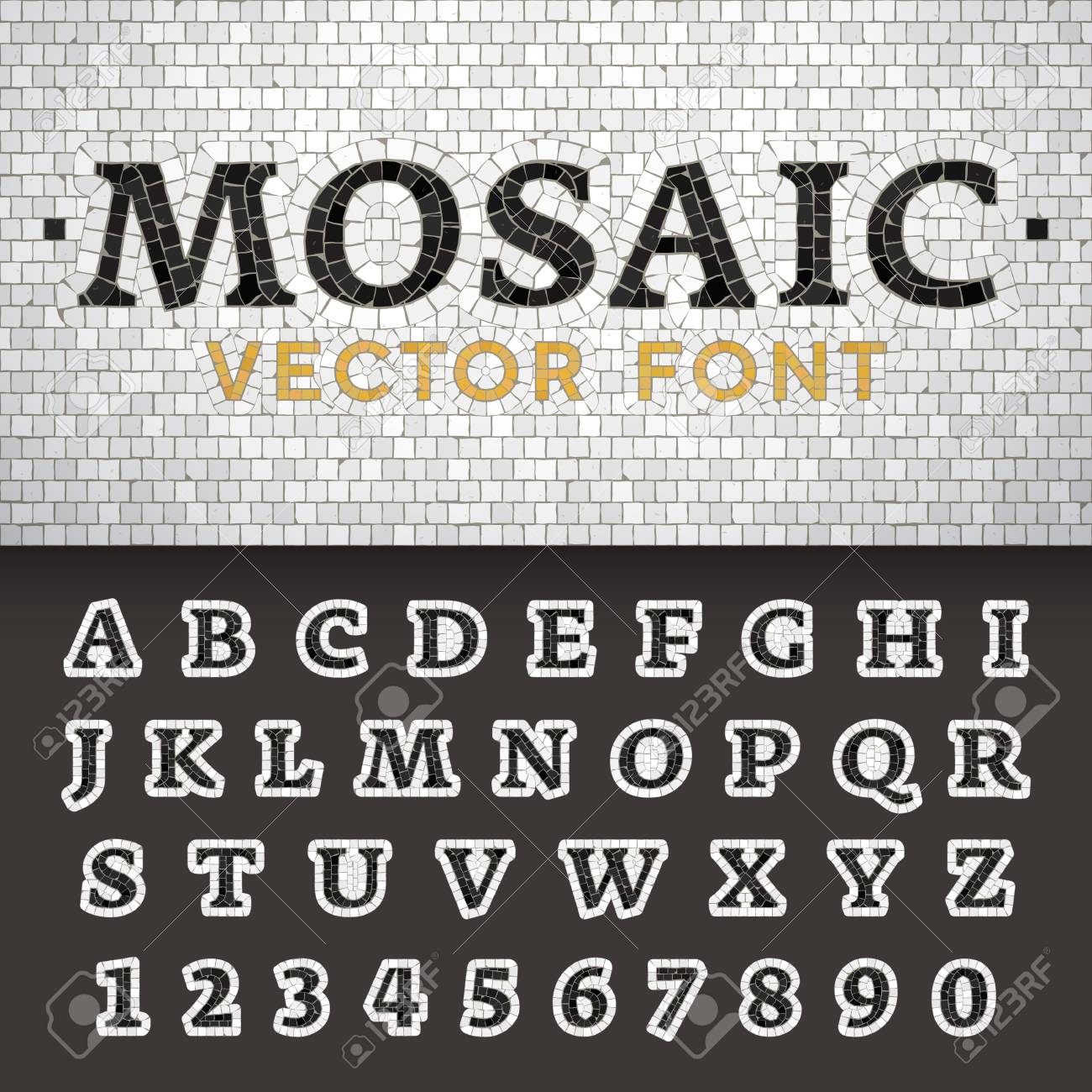 Vektor-Mosaik-Boden-Stil-Schriftart. Lateinische Buchstaben Von A Bis Z Und Zahlen Von Bis 9 Aus Pflastersteinen. Schönes Klassisches Design. Lizenzfrei nutzbare SVG, Vektorgrafiken, Clip Arts, Illustrationen. Image 112238035.