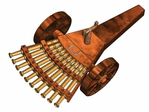 Re - Konstruktion von einem Maschinengewehr oder Multi-Barrel Gewehr, auf einer Zeichnung im Codex Atlanticus - FOLIO 157 basiert. (1478-1519), die von der Italienischen universalgelehrten Leonardo da Vinci (1452-1519).