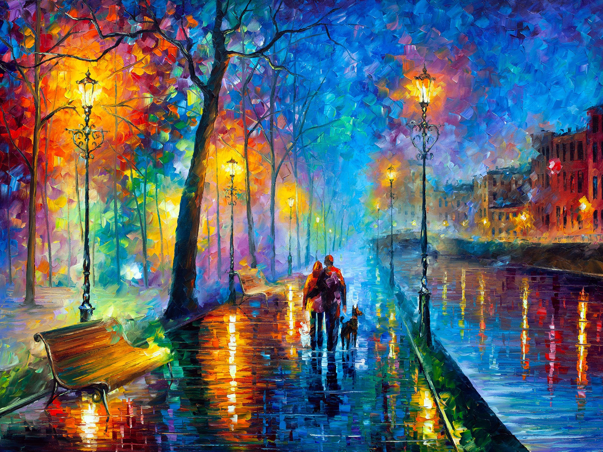 HD wallpaper: Colorful, Leonid Afremov, painting, park, rain, Street Light | Wallpaper Flare