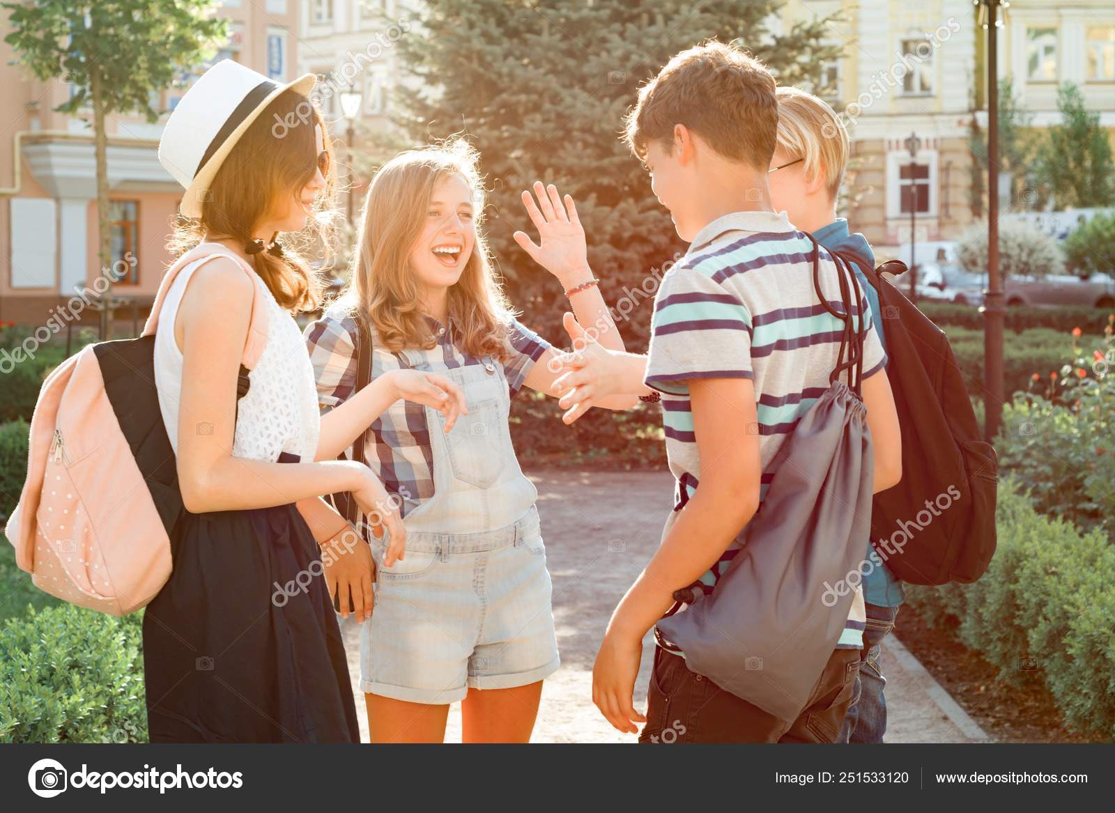 Fröhliche Schüler feiern, Freunde treffen sich in der Schule, junge Leute heben die Hände, stapeln sich und bilden sich gemeinsam in Kreis Stockfotografie - Alamy