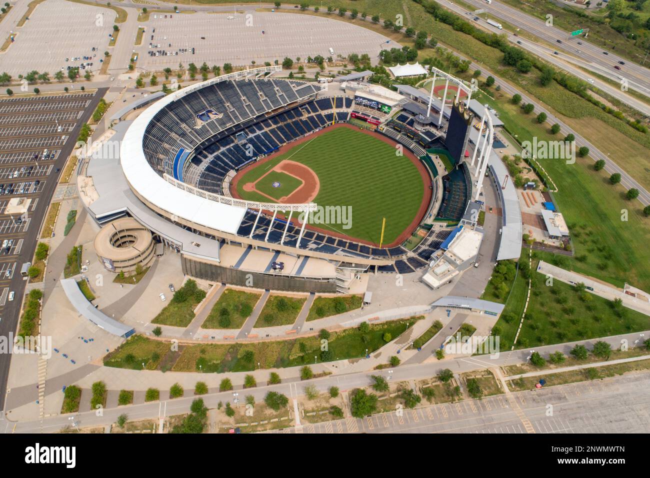 A overall general aerial view of Kauffman Stadium, home of the Kansas City Royals and part of the Harry S. Truman Sports Complex on Wednesday, Aug. 8, 2018, in Kansas City, Mo. (
