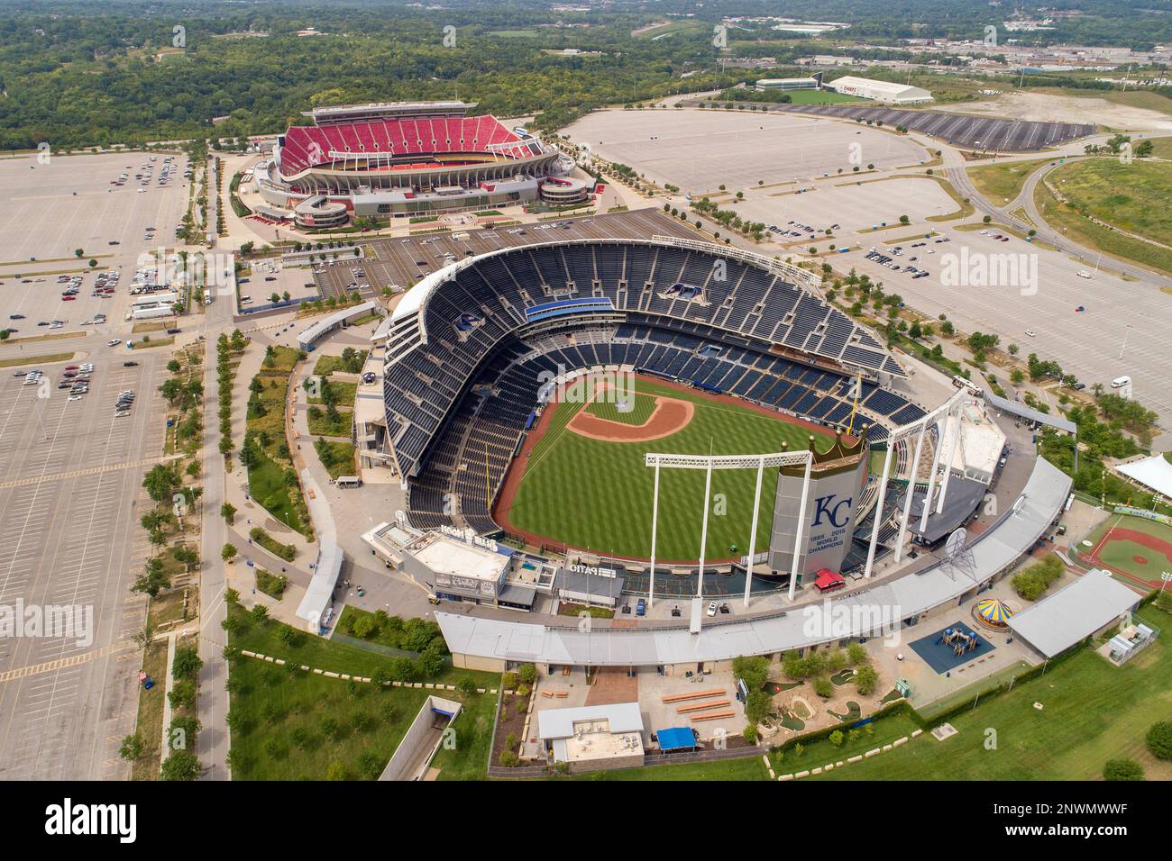 Aerial view of Kauffman Stadium and Arrowhead Stadium at the Truman Sports Complex in Kansas City, Missouri, USA - SuperStock
