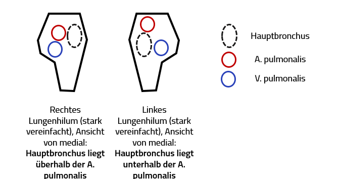 Am Lungenhilus treten die Stammbronchien in die Lunge ein, rechts drei Lappenbronchien, links zwei Lappenbronchien.