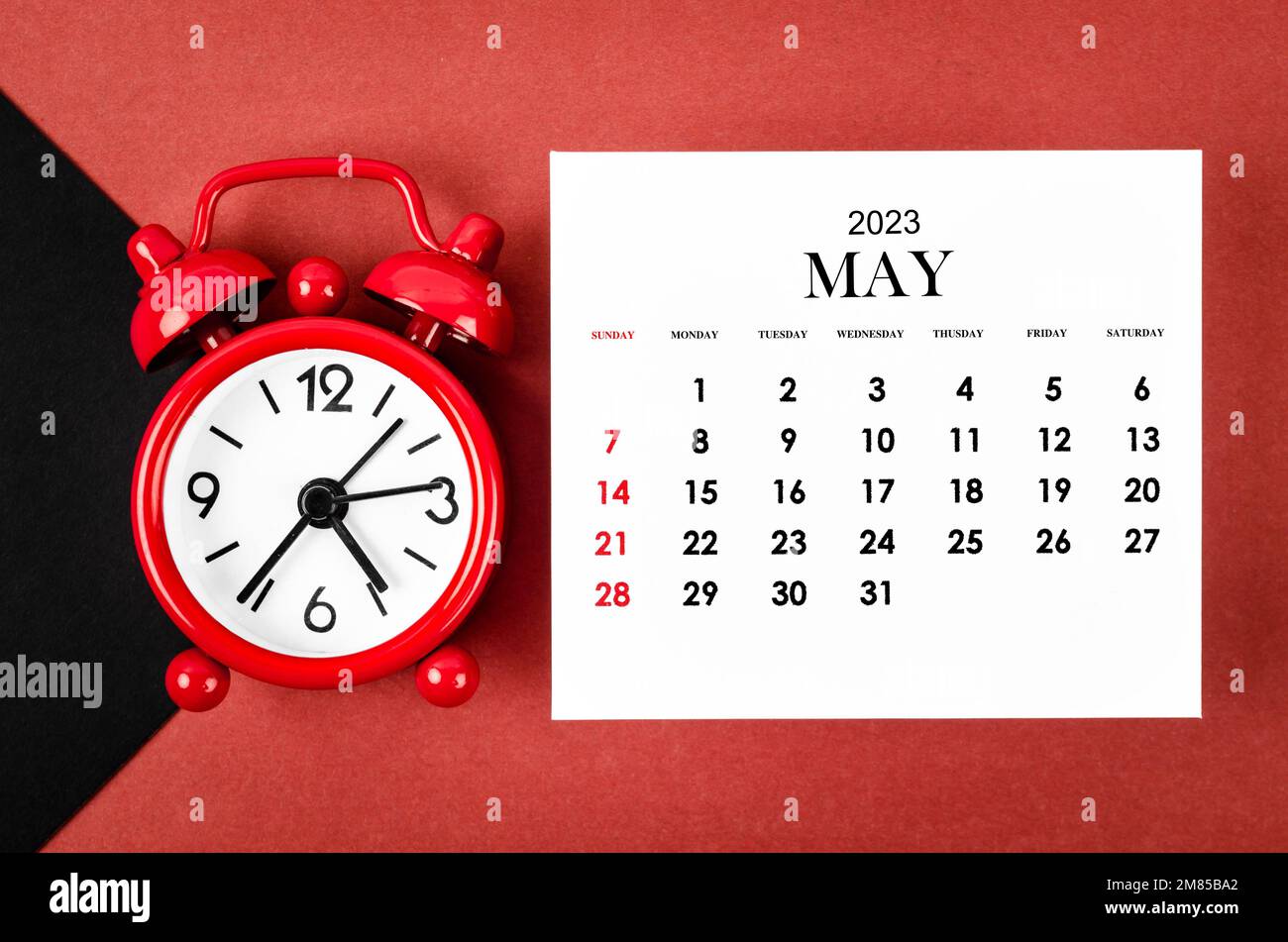 Mai 2023 Monatliches Kalenderjahr mit Wecker auf rotem und ...
