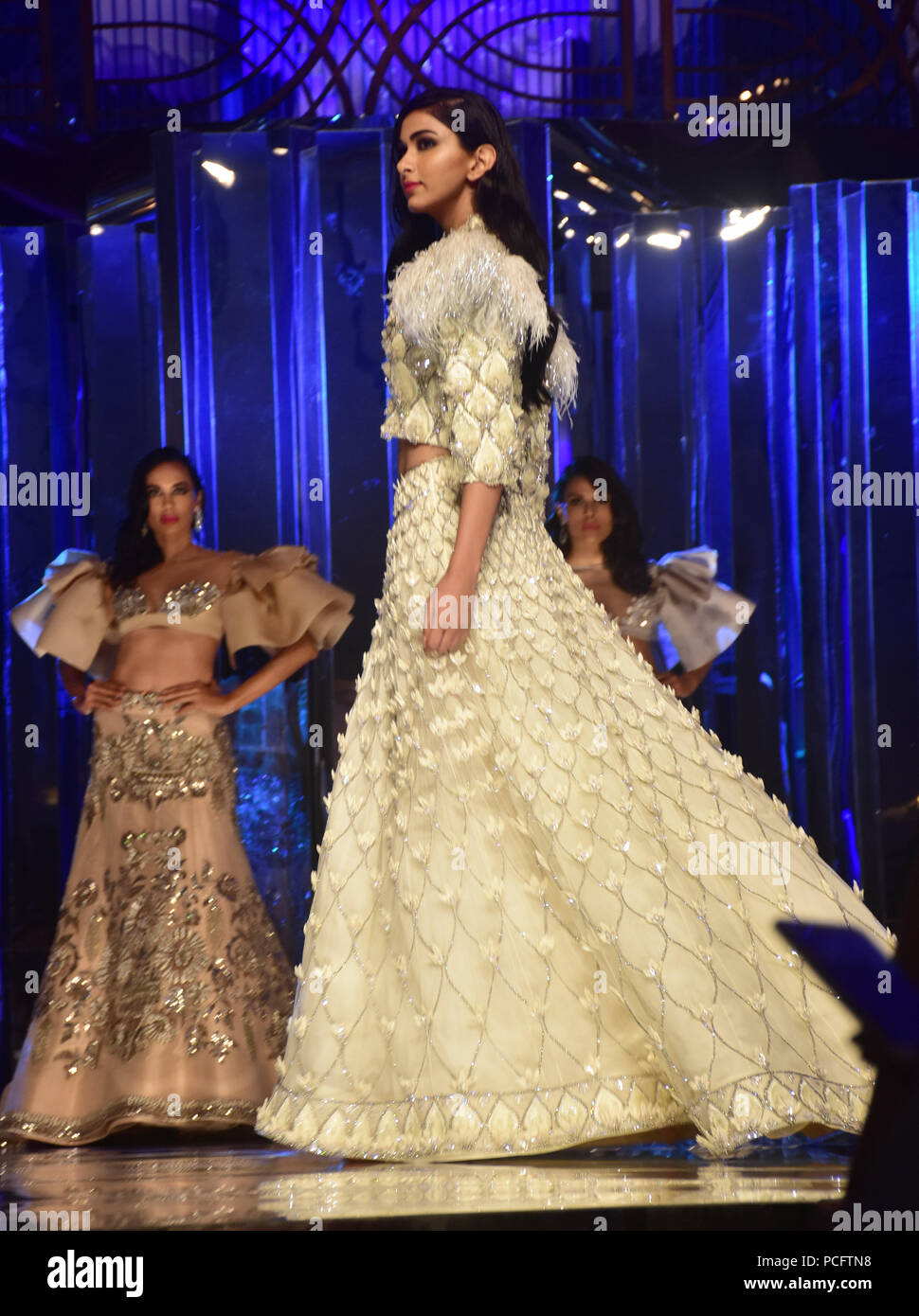 Mumbai, Indien. 1 Aug, 2018. Indische Modelle anzeigen Sammlung von Designer Manish Malhotra 2018 der Haute Couture Fashion Show im Hotel JW Marriott, Juhu in Mumbai. Credit: Azhar Khan/SOPA Images/ZUMA Draht/Alamy leben