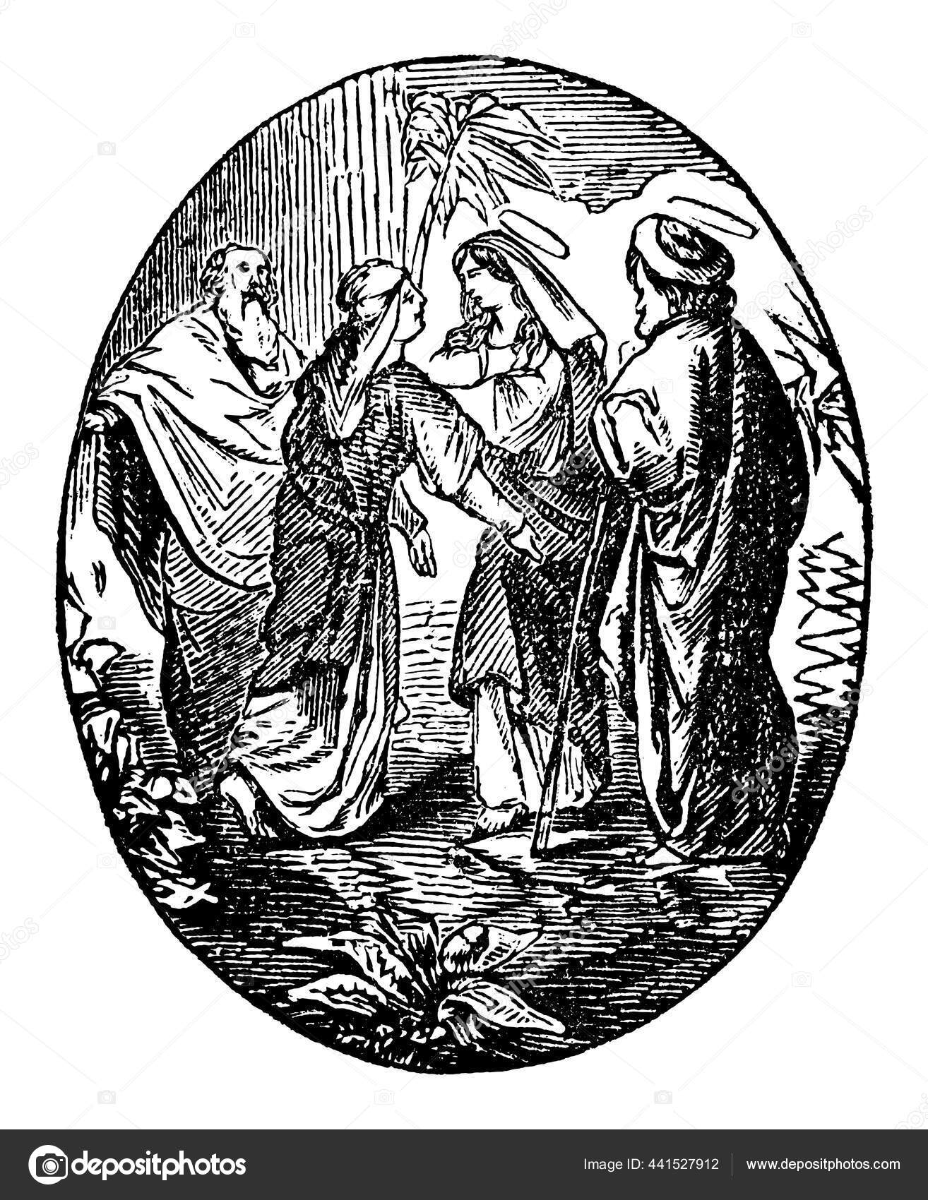 Jahrgangszeichnung der biblischen Geschichte der Jungfrau Maria, Mutter des Jesus, zu Besuch bei der Heiligen Eliza. Bibel, Neues Testament, Lukas 1 Stock-Vektorgrafik von ©[email protected] 331719998