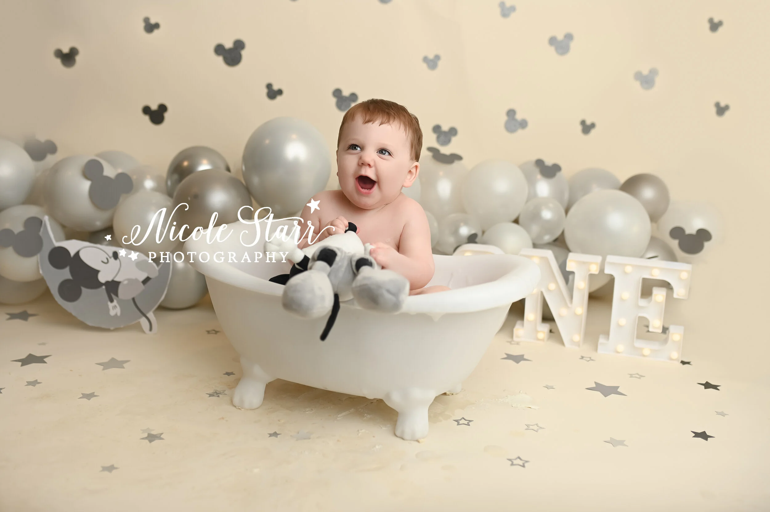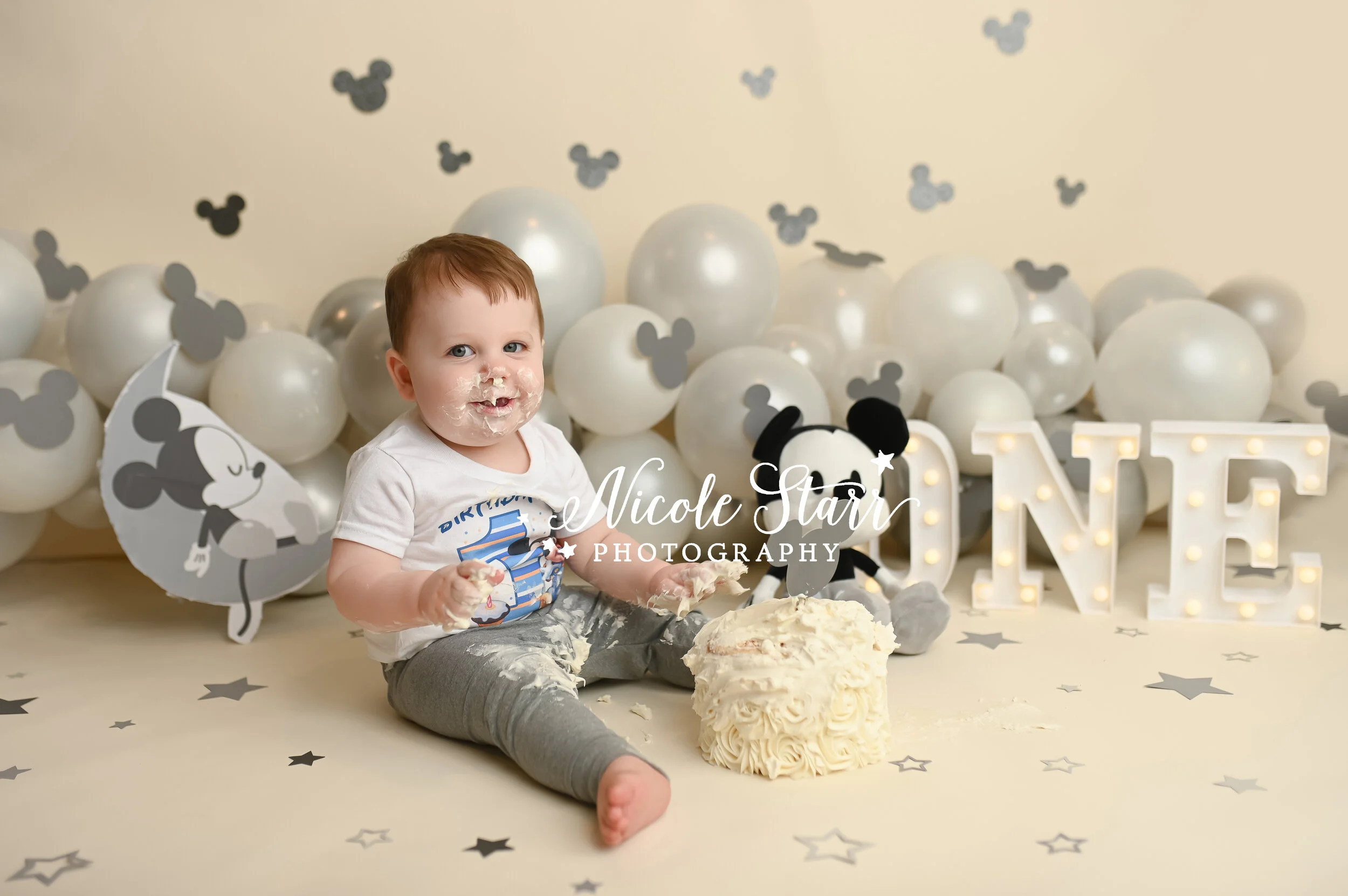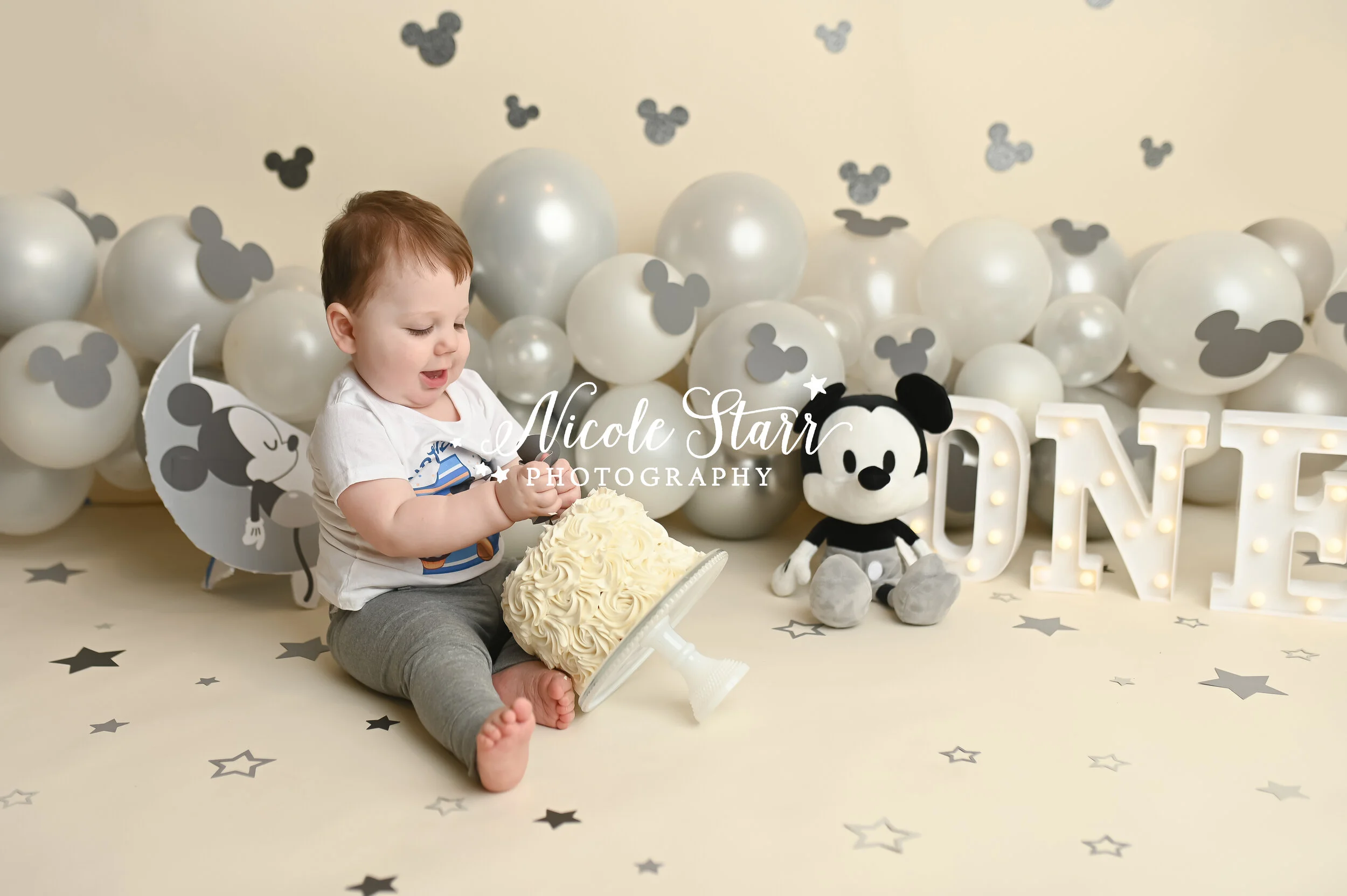 A Mickey Mouse Cake Smash with Gray and Cream Accents — Saratoga Springs Baby Photographer, Nicole Starr Photography