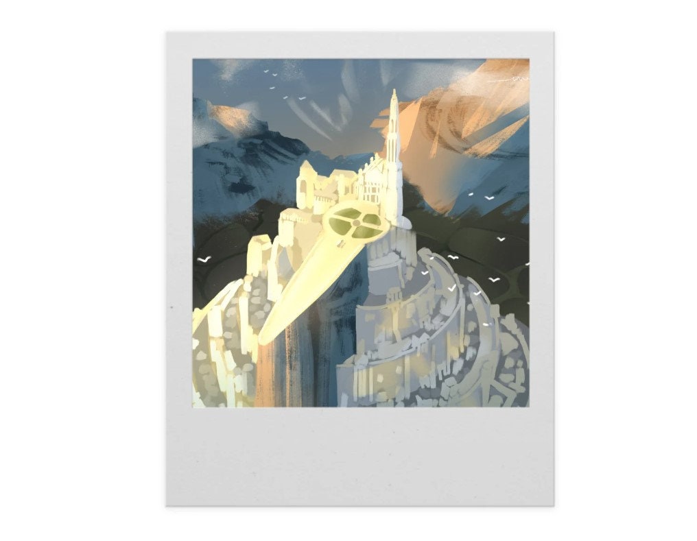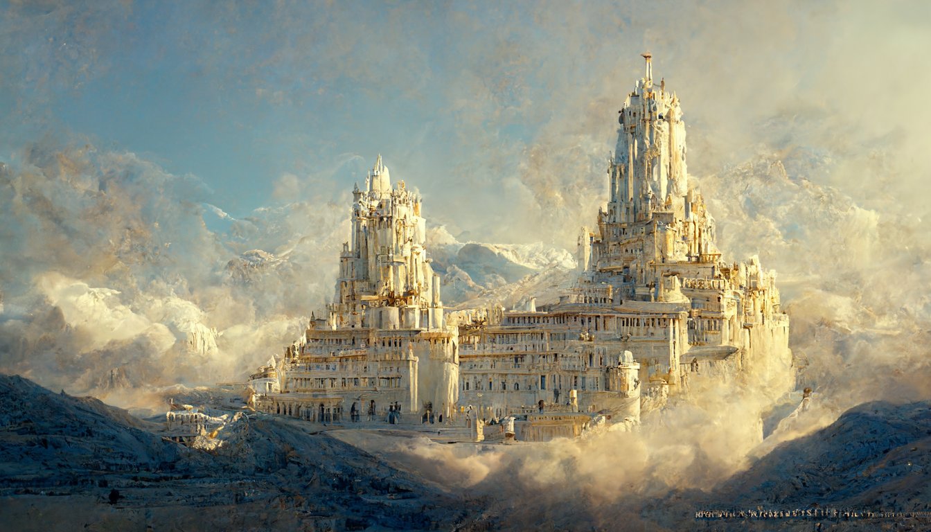 Prompthunt: Minas Tirith, white city set against the Sierra Nevada mountains art nouveau architecture, Lord of the Rings, Alan Lee, blue sky, illustration, dramatic lighting, epic composition, super detailed, 8k, octane renderer,
