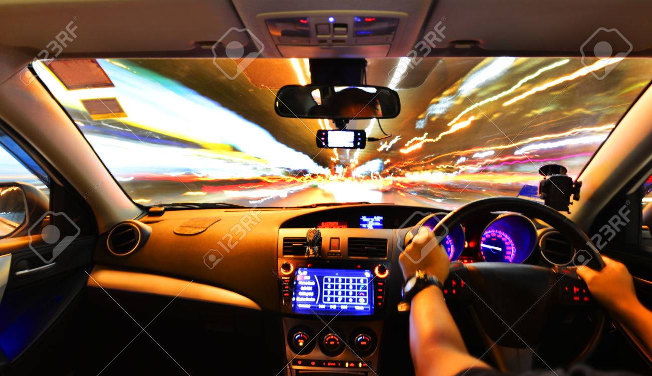 Auto Innenraum Beim Fahren. Verschwommene Nachtlichter Lizenzfreie ...