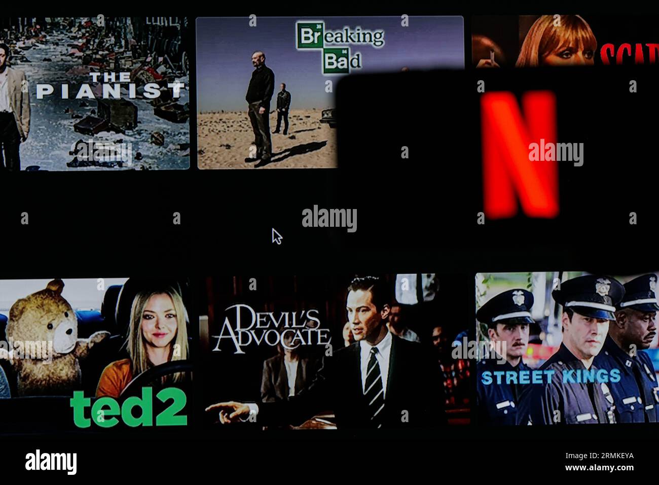 26. August 2023: Gaziantep, Türkei. 28. August 2023. Das Logo der Netflix App auf einem Smartphone. Netflix ist ein Streaming-Dienst für Filme, Fernsehserien und -Shows sowie Dokumentarfilme, der als Abonnement erhältlich ist.