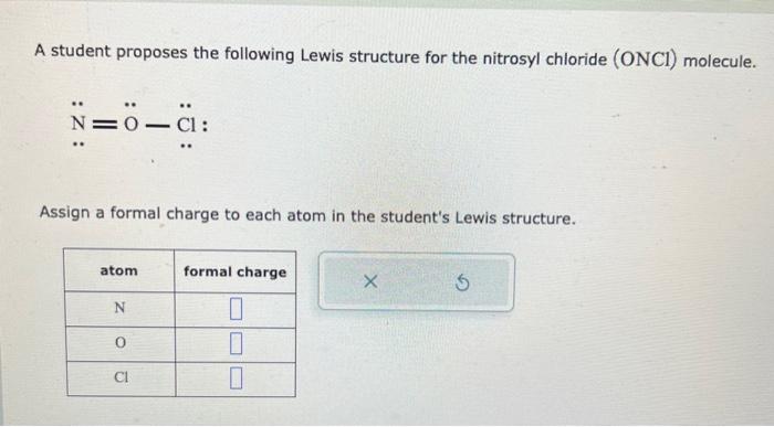SOLVED: A student proposes the following Lewis structure for the nitrosyl chloride (ONCl) molecule: N=O-Cl Assign formal charge to each atom in the student's Lewis structure: atom formal charge