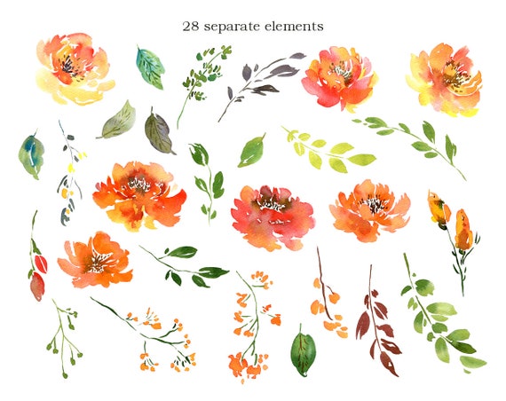 Aquarell Blumen Clipart Sommer Orange Grün Blumen Clip Art Digital ...